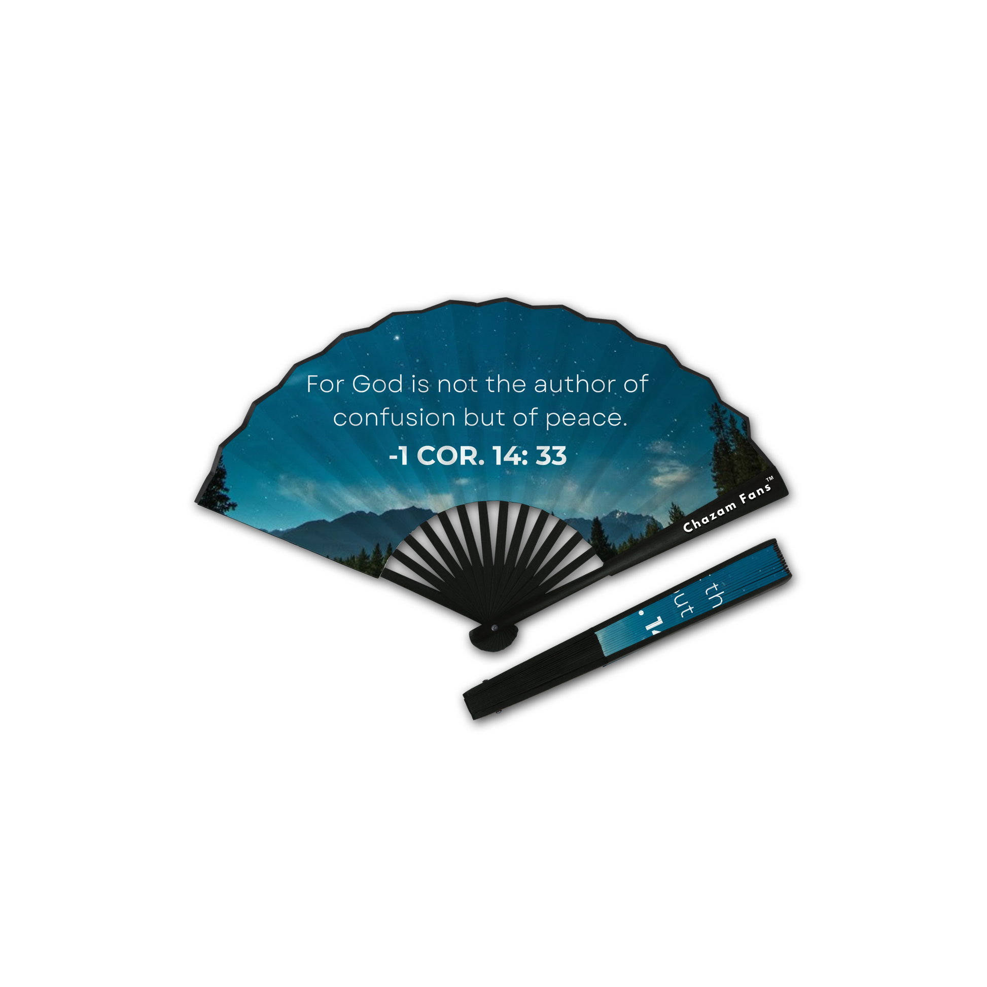 “God Is Peace” Chazam Fan – Rest in the stillness of His presence with every flick of your wrist. This serene design carries the comforting words of 1 Corinthians 14:33: “For God is not the author of confusion but of peace.” With each calming clack, you’re not only cooling down—you’re spreading a spirit of harmony and reassurance. A perfect reminder that true peace is found in Him, wherever you go.