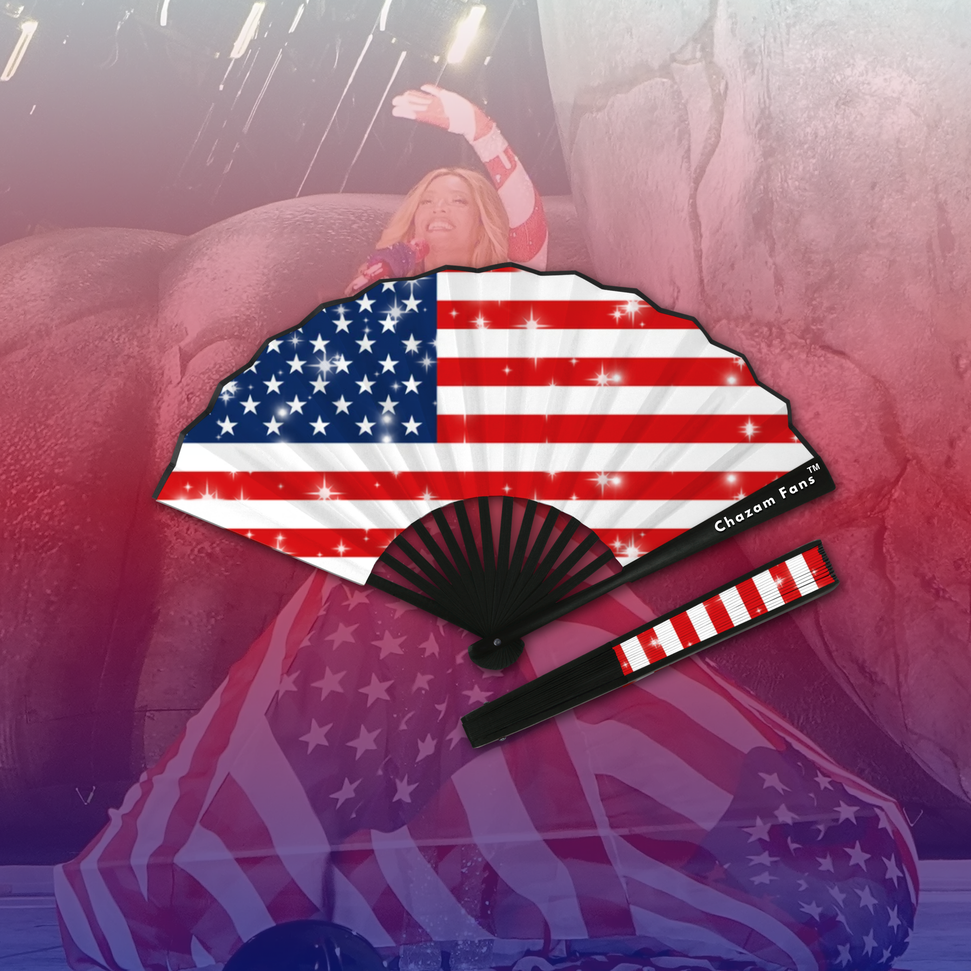 This ain’t just a fan — it’s a statement. Inspired by Beyoncé’s powerful anthem “AMERIICAN REQUIEM,” this USA Sparkled Chazam Fan waves boldness, resilience, and rhythm in every clack. Featuring red, white, and revolution, this limited edition release is adorned with shimmering accents that catch the light like fireworks on the 4th.